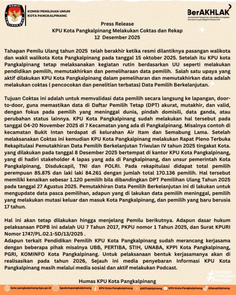 Press Release KPU Kota Pangkalpinang Melakukan Coktas dan Rekap