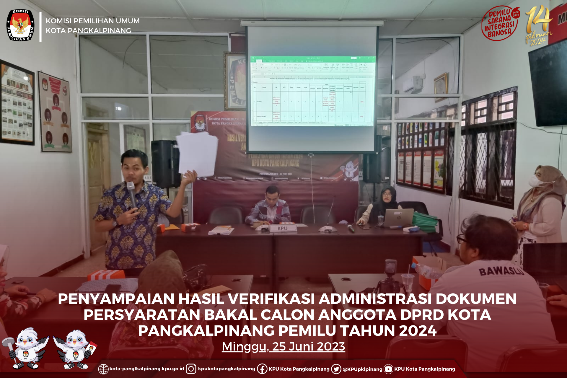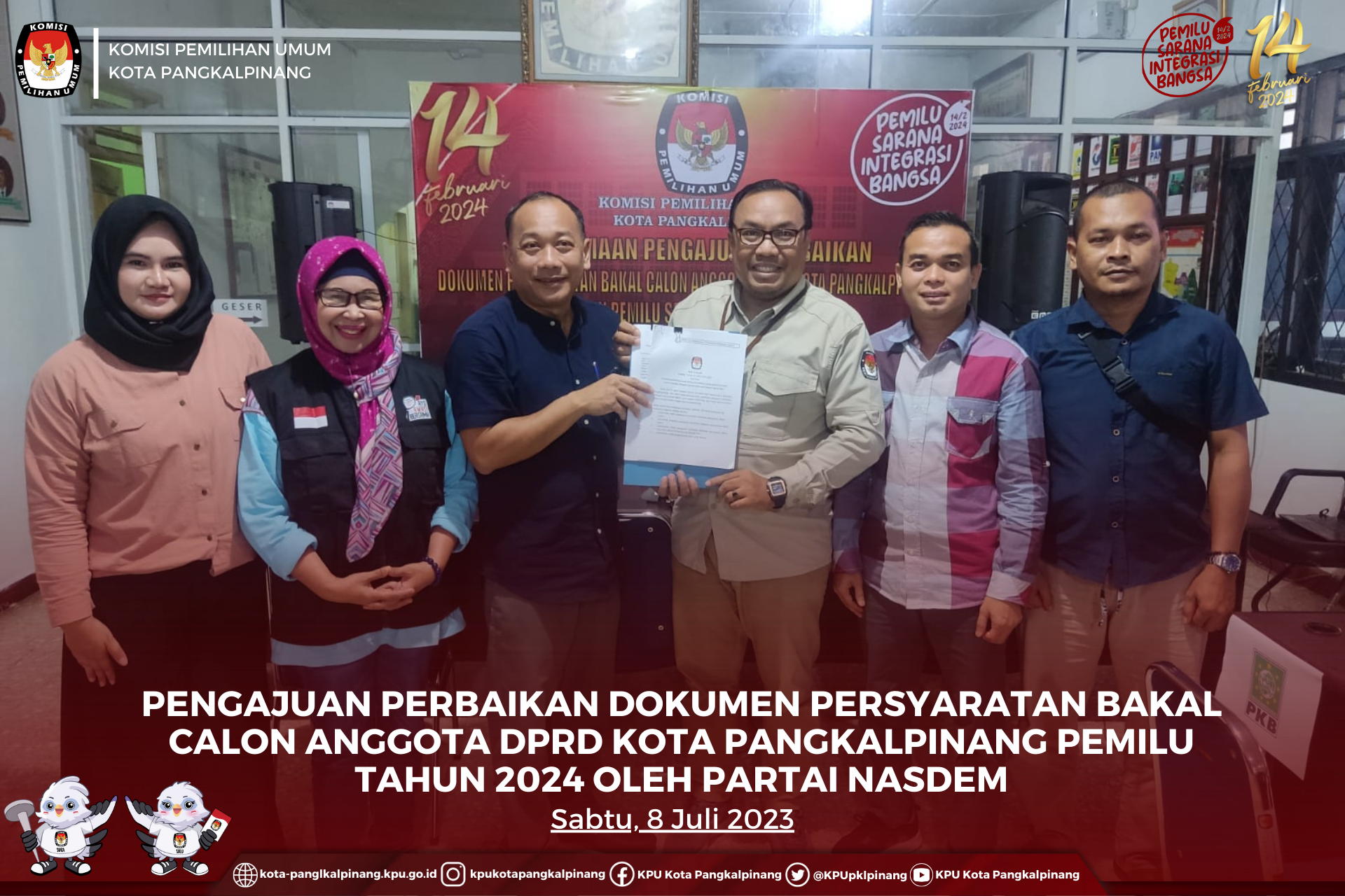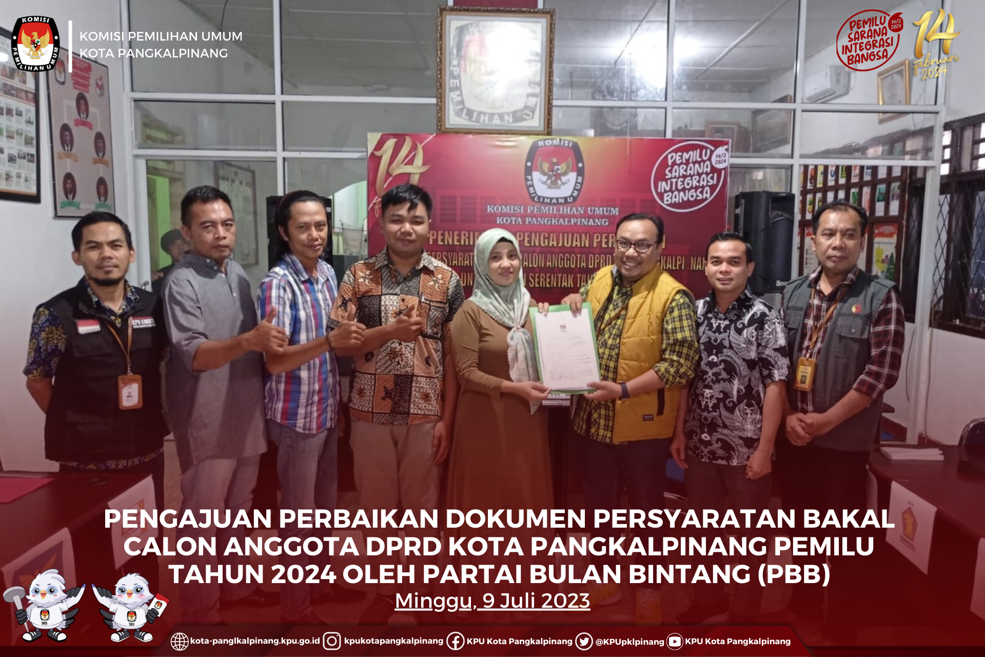 Pengajuan dilakukan pada pukul 09.25 WIB. Delegasi partai diterima oleh Ketua KPU Kota Pangkalpinang, Penti, Anggota KPU Yusmayadi dan Ruslan, didampingi Kasubbag Teknis Penyelenggara Pemilu, Partisipasi, dan Hubungan Masyarakat, M. Nazir serta disaksikan oleh Bawaslu, di ruang rapat KPU Kota Pangkalpinang. (humas kpu kota pangkalpinang)
