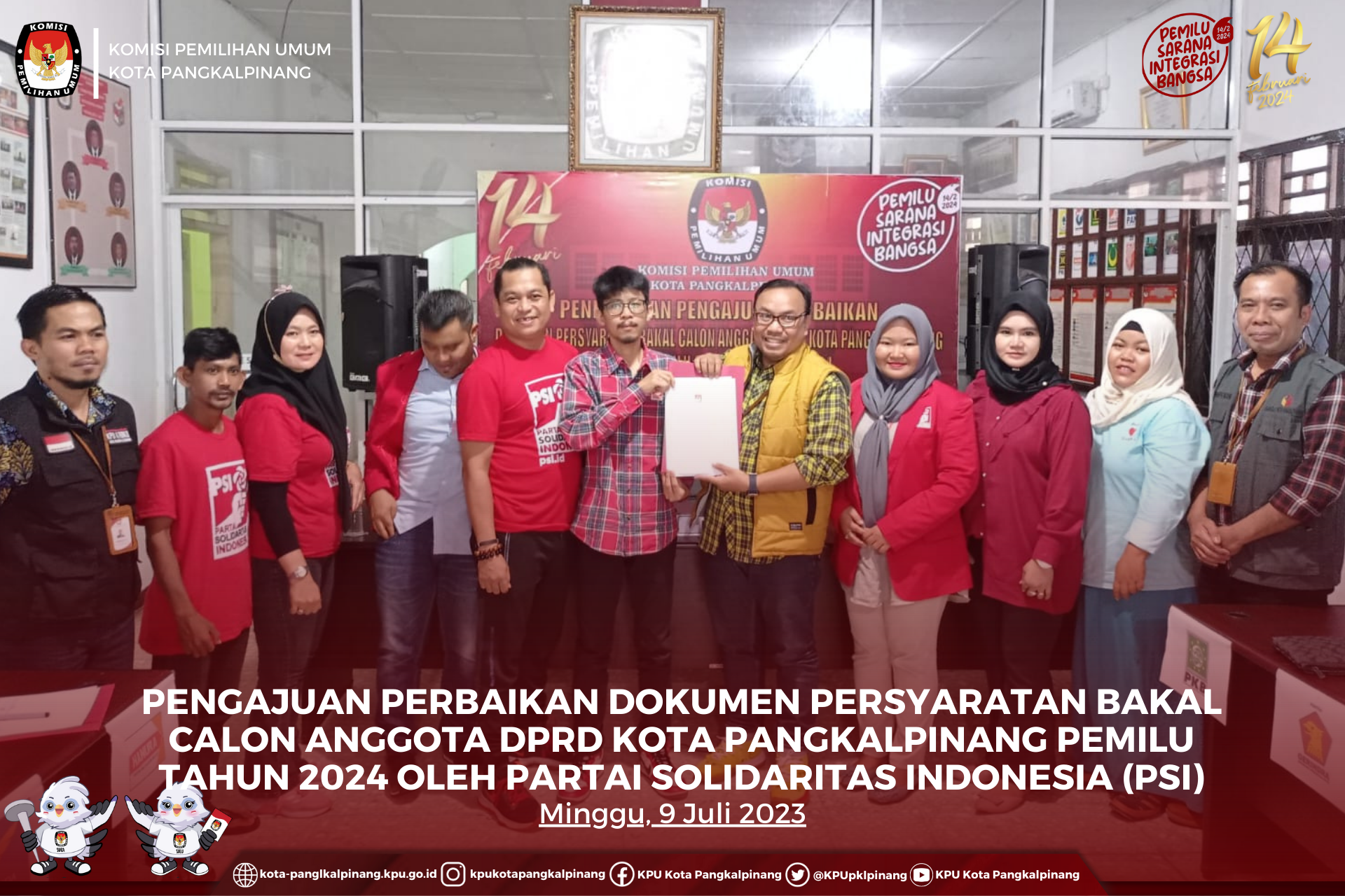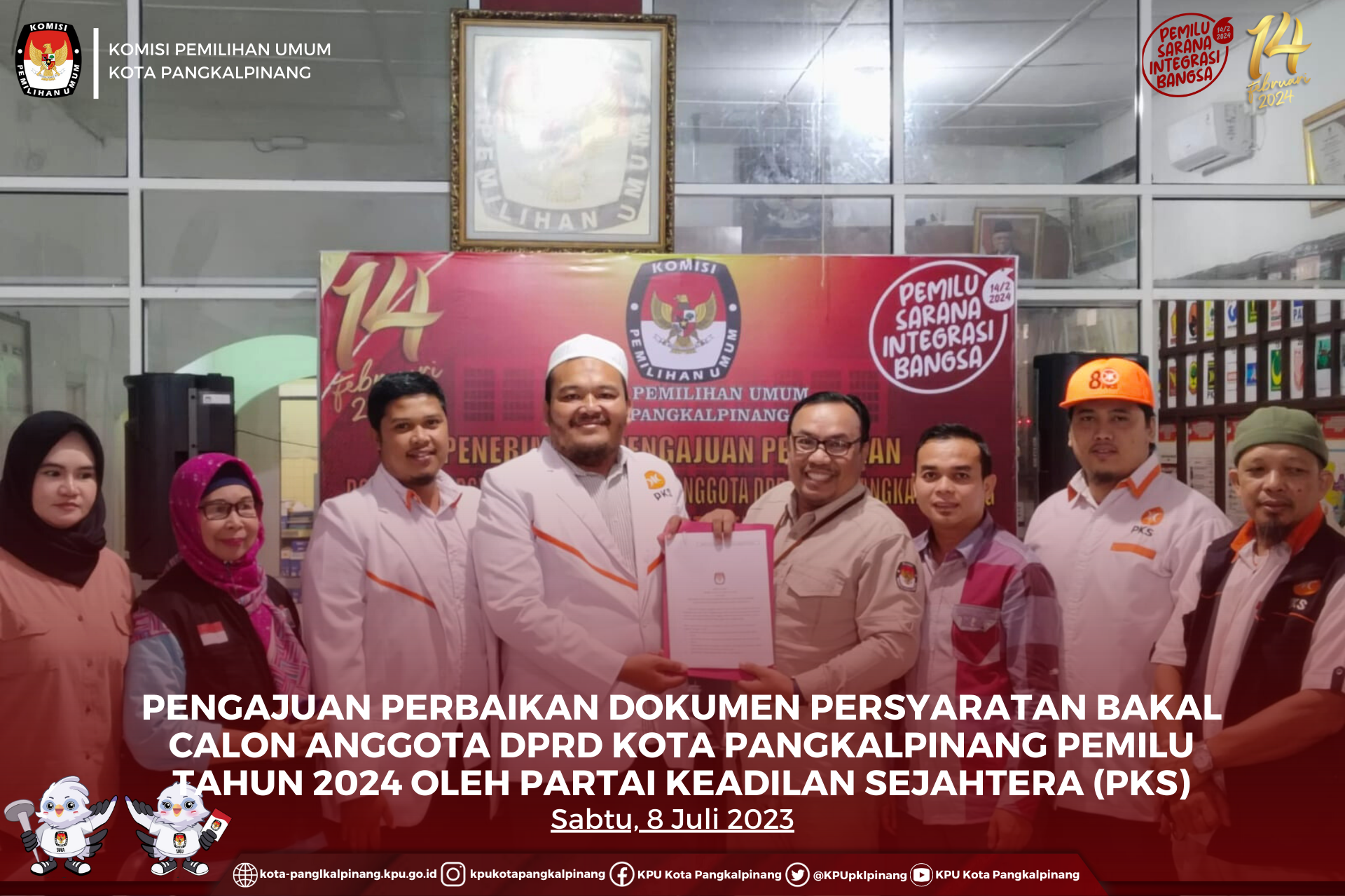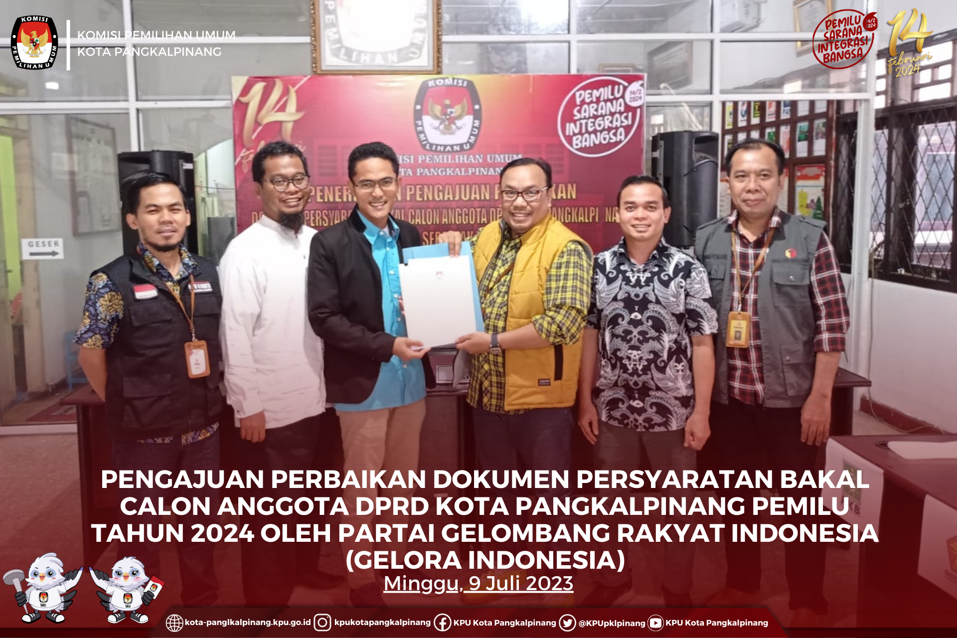 Pangkalpinang, kota-pangkalpinang.kpu.go.id - Partai Gelombang Rakyat Indonesia (Gelora Indonesia) Kota Pangkalpinang mengajukan perbaikan dokumen persyaratan Bakal Calon Anggota DPRD Kota Pangkalpinang Pemilu Tahun 2024, Minggu (09/07/2023) di Kantor KPU Kota Pangkalpinang.