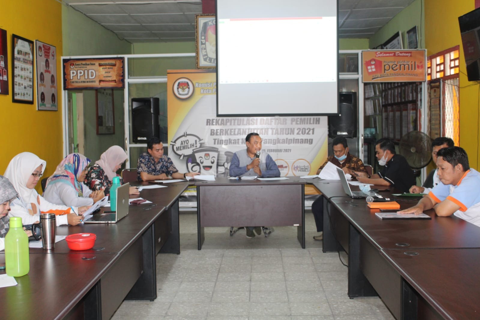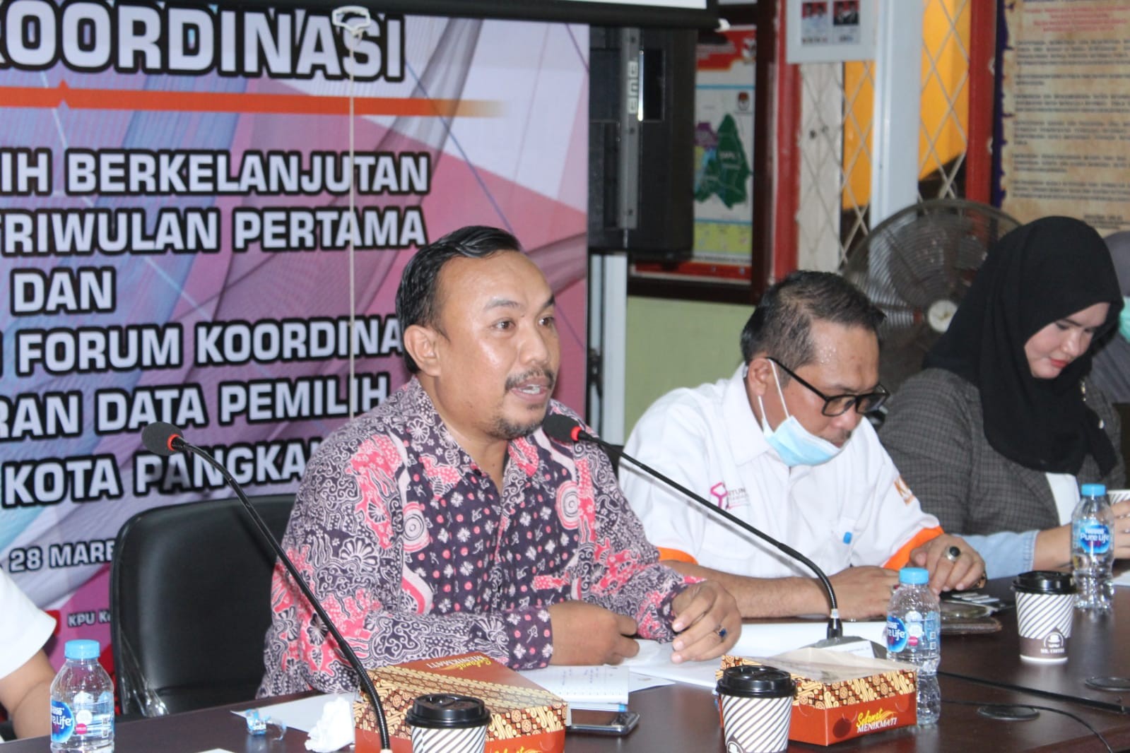 Pangkalpinang, kota-pangkalpinang.kpu.go.id - Senin (28/03/2022), KPU Kota Pangkalpinang menggelar Rapat Koordinasi Rekapitulasi Daftar Pemilih Berkelanjutan Tahun 2022 Triwulan I dan Pembentukan Forum Koordinasi Pemutakhiran Data Pemilih Berkelanjutan Tahun 2022. Rakor kali ini dihadiri oleh stakeholder terkait, diantaranya yaitu perwakilan dari Kodim 0413 Bangka, Bawaslu Kota Pangkalpinang, Kesbangpol Kota Pangkalpinang, Cabang Dinas Pendidikan Wilayah 1 Bangka Belitung, Lapas IIA Tuatunu, Lapas Perempuan, Lapas Narkotika, Camat se-Kota Pangkalpinang, dan Perwakilan dari forum keagamaan di kota Pangkalpinang, yaitu PDPM Muhammadiyah Kota Pangkalpinag, Persekutuan Gereja-Gereja Indonesia (PGI) Kota Pangkalpinang, Konferensi Waligereja Indonesia (KWI) Kota Pangkalpinang, Persatuan Umat Buddha Indonesia (Permabudhi) Kota Pangkalpinang, serta Parisada Hindu Dharma Indonesia (PHDI) Kota Pangkalpinang. Hadir pula sebagai narasumber, Bapak Guid Cardi, Anggota Divisi Data KPU Provinsi Kep. Bangka Belitung yang men-sosialisasikan PKPU No. 5 dan 6 serta membentuk Forum Koordinasi Pemutakhiran Daftar Pemilih Berkelanjutan Tahun 2022. Adapunjumlah rekapitulasi daftar pemilih berkelanjutan pada Triwulan I tahun 2022 ini adalah sebanyak 138.147 pemilih, dengan rincian 68.640 pemilih laki-laki dan 69.507 pemilih perempuan. (humas kpu kota pangkalpinang)