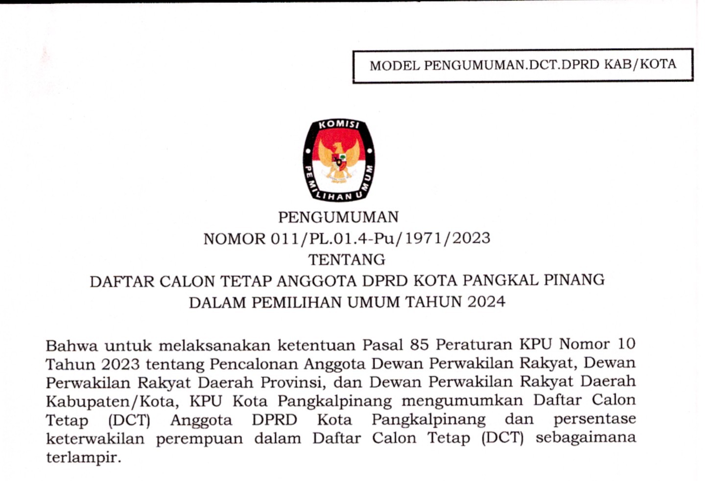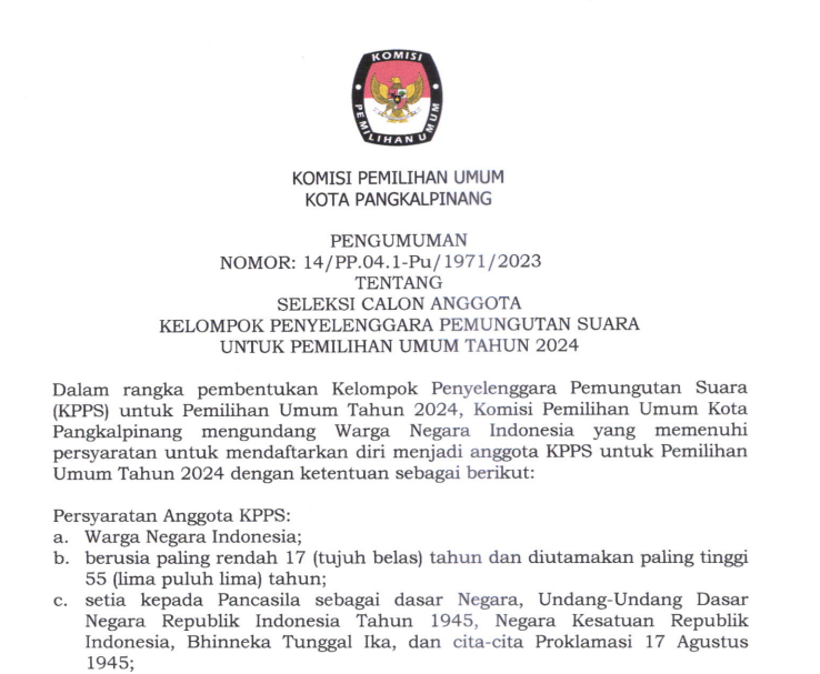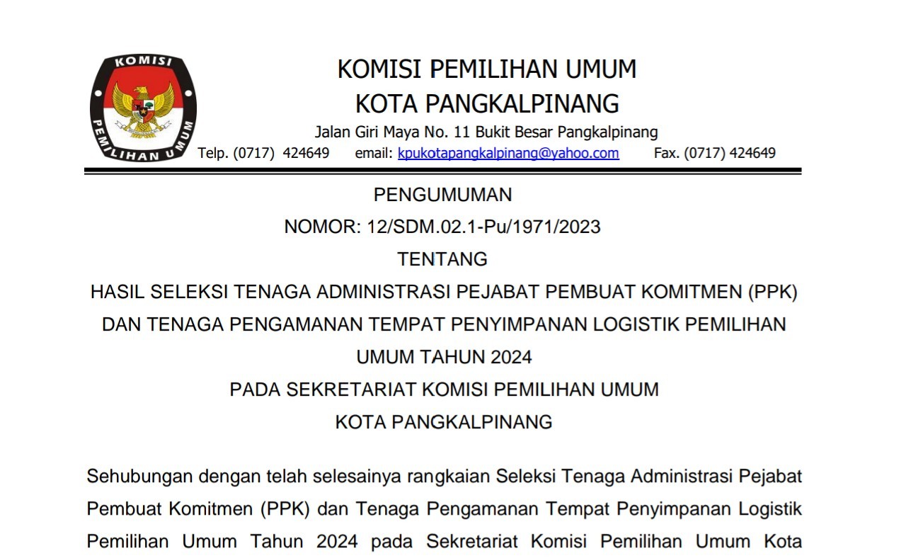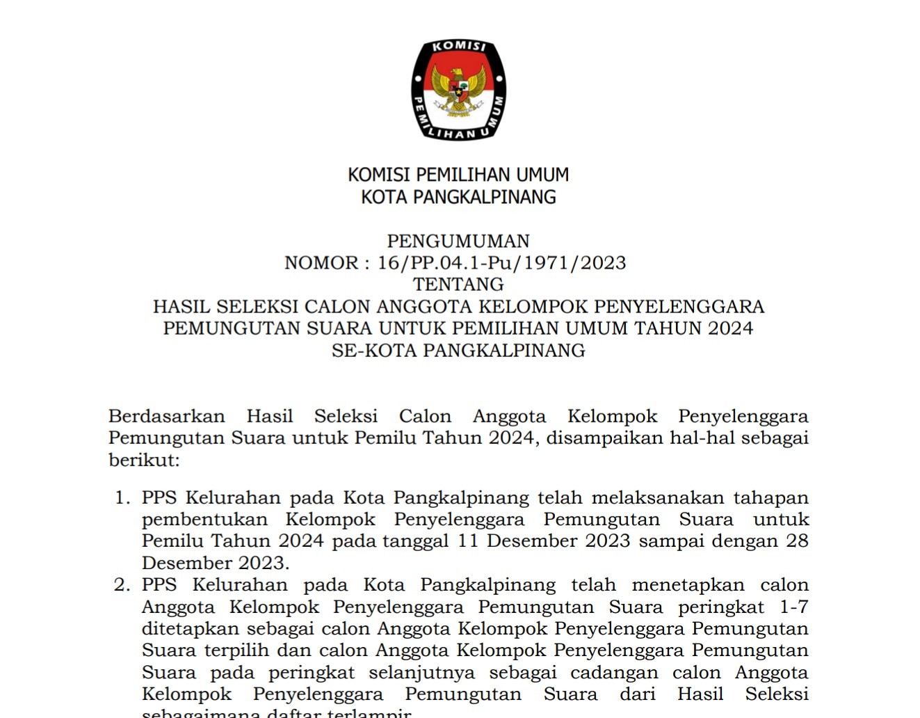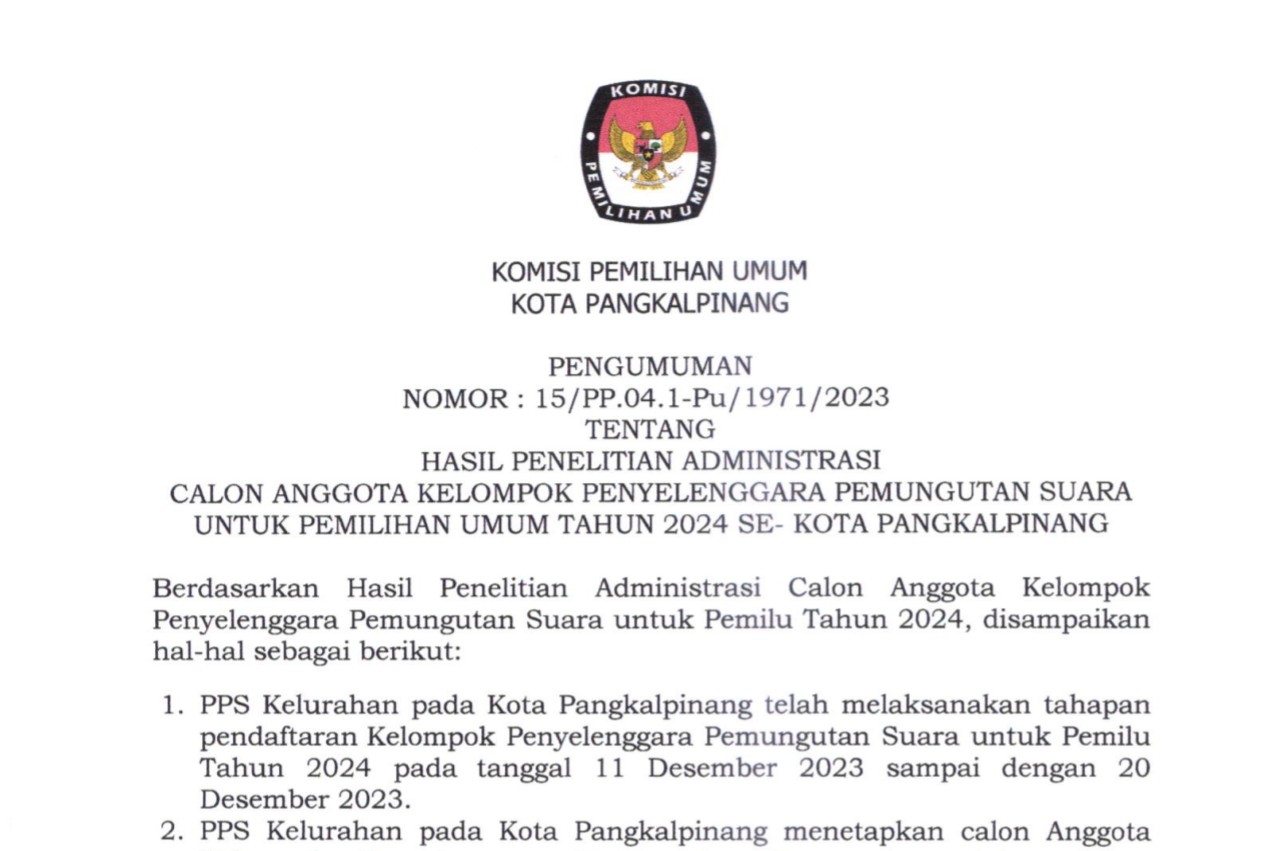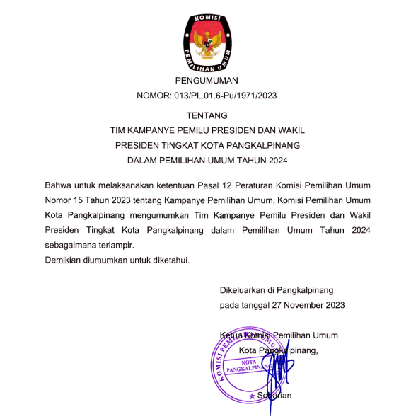 Pengumuman Tim Pelaksana Kampanye Pemilu Presiden dan Wakil Presiden Tingkat Kota Pangkalpinang dalam Pemilihan Umum Tahun 2024 dapat diunduh disini: