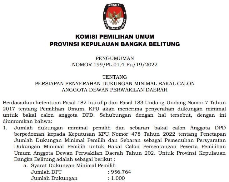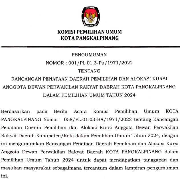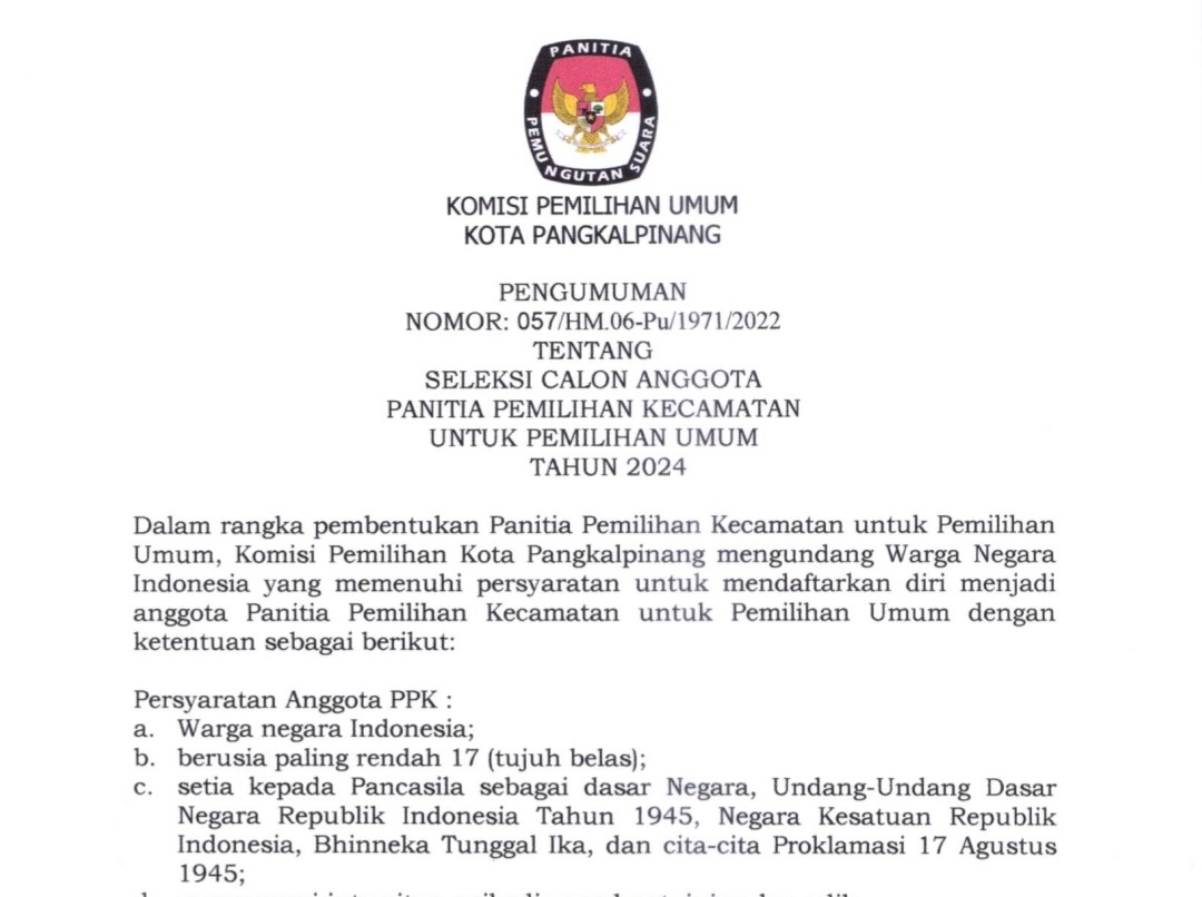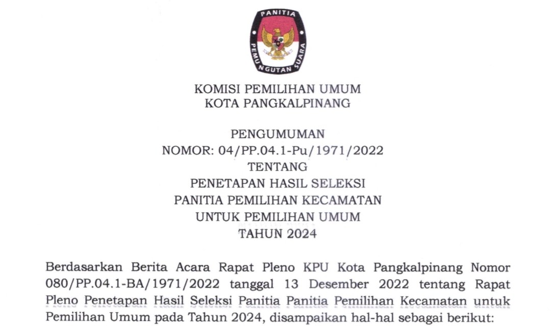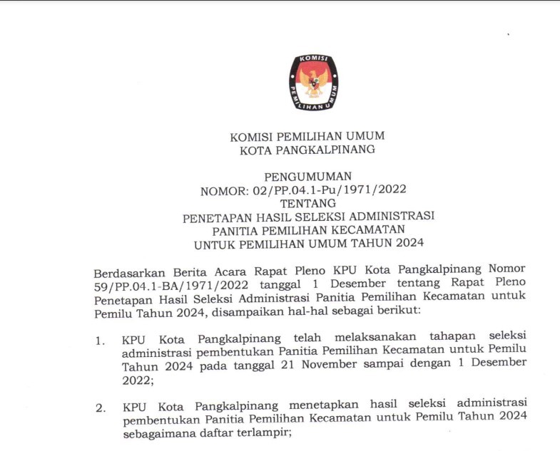 Pengumuman Hasil Seleksi Administrasi Calon Anggota Panitia Pemilihan Kecamatan (PPK) Untuk Pemilu Tahun 2024