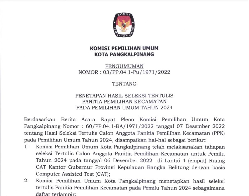 Pengumuman Hasil Seleksi Tertulis Panitia Pemilihan Kecamatan (PPK) Untuk Pemilu Tahun 2024