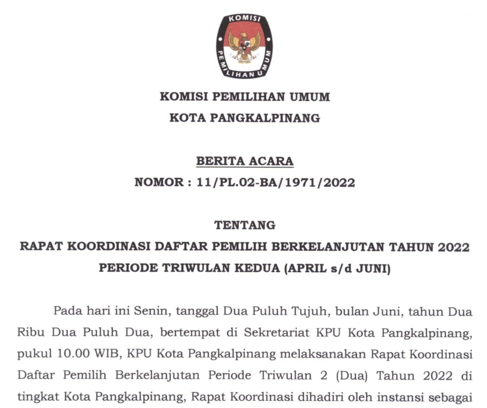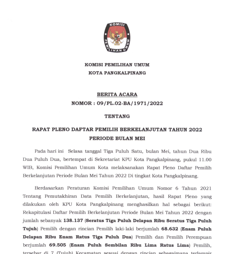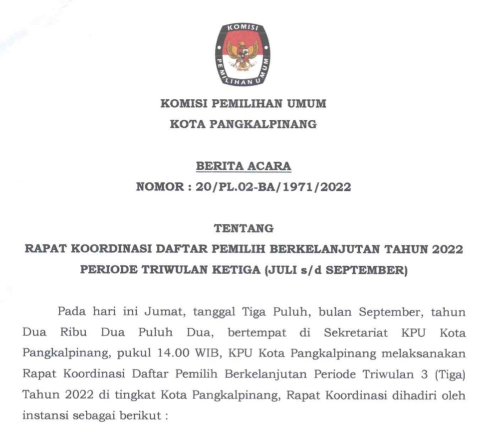 Berita Acara Rekapitulasi Daftar Pemilih Berkelanjutan Kota Pangkalpinang Tahun 2022 Triwulan III (Juli s.d. September)