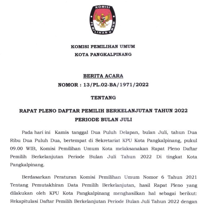 Berita Acara Rekapitualasi Daftar Pemilih Berkelanjutan Kota Pangkalpinang Bulan Juli Tahun 2022