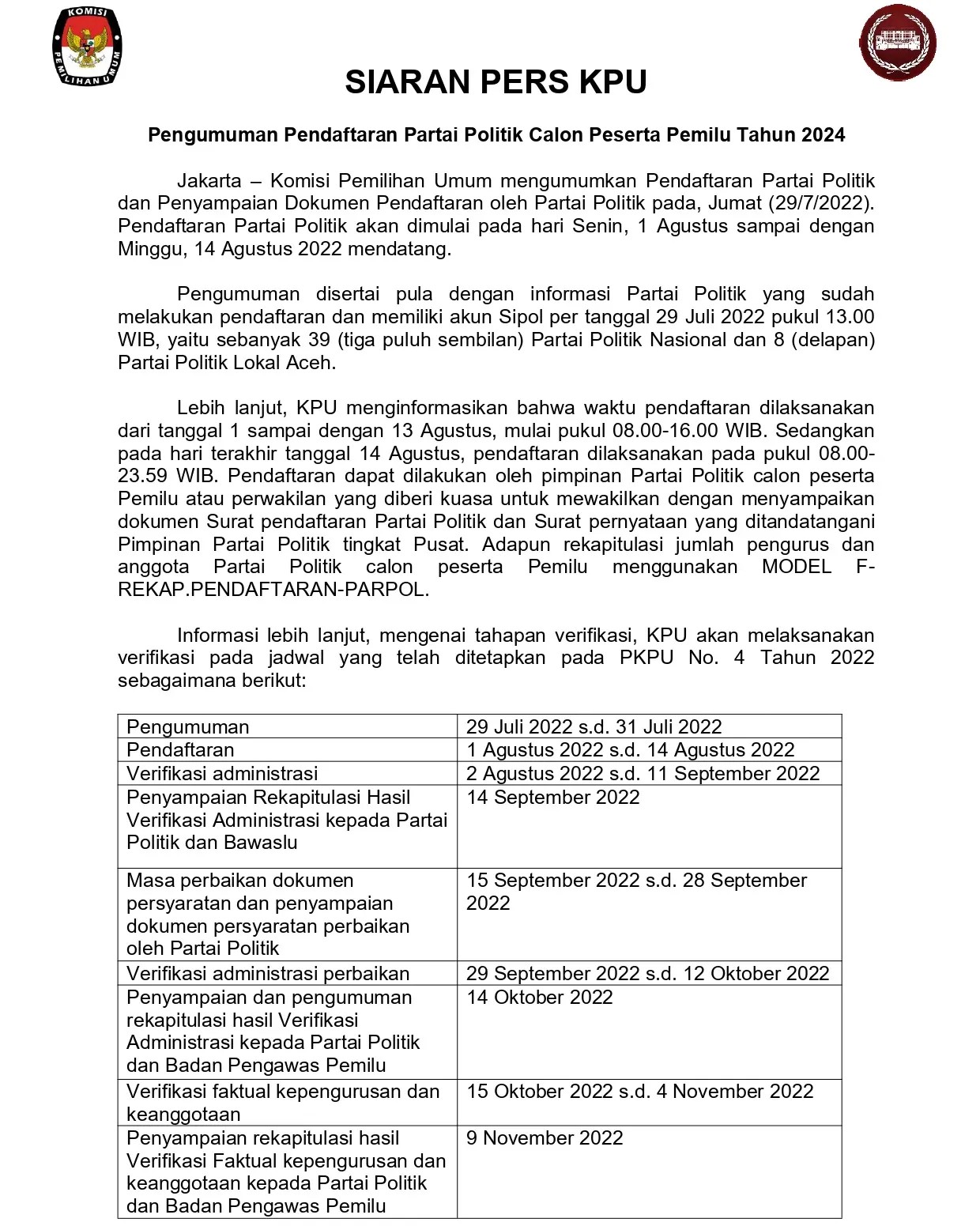 Berikut kami sampaikan siaran pers pengumuman pendaftaran partai politik calon peserta Pemilu tahun 2024.
