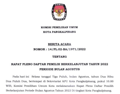 Berita Acara Rekapitualasi Daftar Pemilih Berkelanjutan Kota Pangkalpinang Bulan Agustus Tahun 2022
