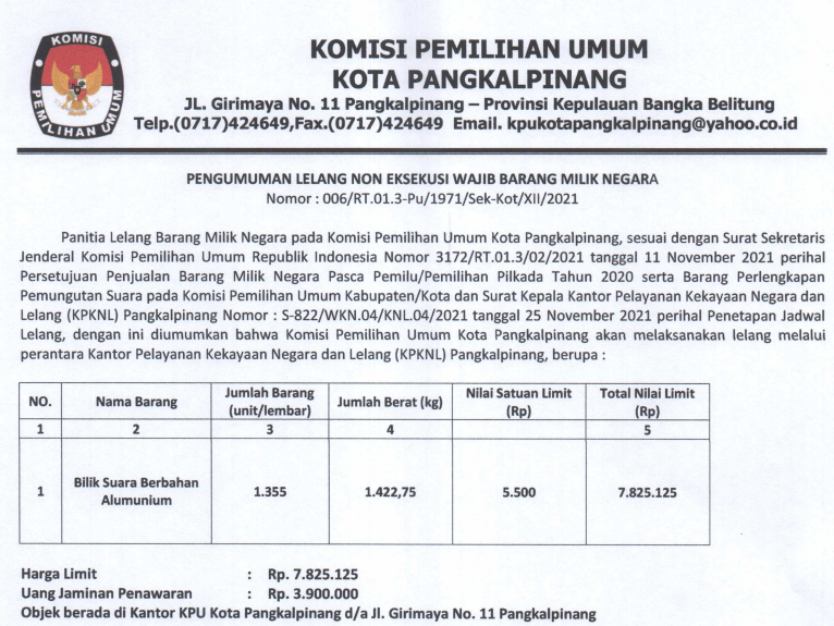 Pengumuman Lelang Non Eksekusi Wajib Barang Milik Negara KPU Kota Pangkalpinang.