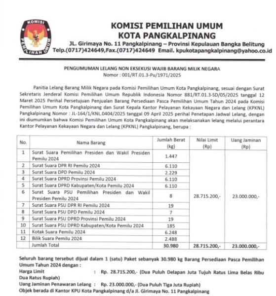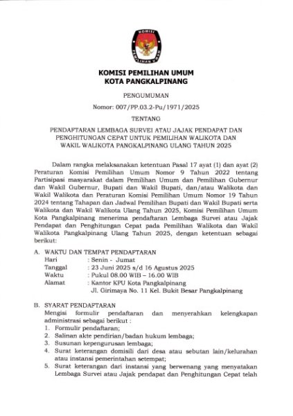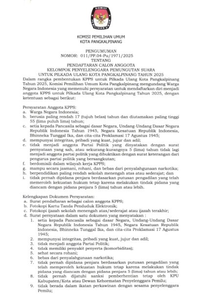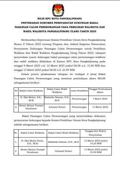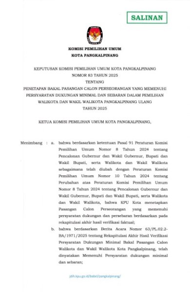 KEPUTUSAN KOMISI PEMILIHAN UMUM KOTA PANGKALPINANG NOMOR 83 TAHUN 2025 TENTANG PENETAPAN BAKAL PASANGAN GALON PERSEORANGAN YANG MEMENUHI PERSYARATAN DUKUNGAN MINIMAL DAN SEBARAN DALAM PEMILIHAN WALIKOTA DAN WAKIL WALIKOTA PANGKALPINANG ULANG TAHUN 2025