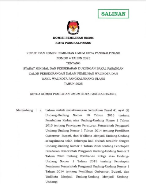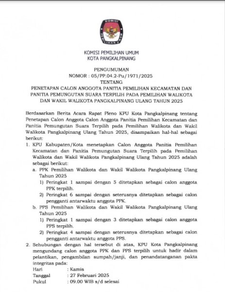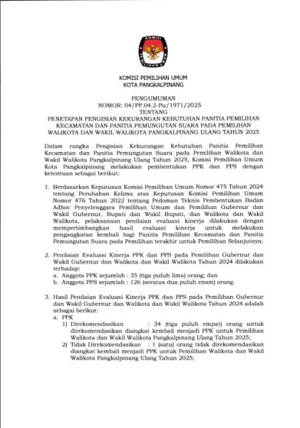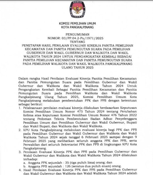 PENETAPAN HASIL PENILAIAN EVALUASI KINERJA PANITIA PEMILIHAN KECAMATAN DAN PANITIA PEMUNGUTAN SUARA PADA PEMILIHAN GUBERNUR DAN WAKIL GUBERNUR DAN WALIKOTA DAN WAKIL WALIKOTA TAHUN 2024 UNTUK PENGANGKATAN KEMBALI SEBAGAI PANITIA PEMILIHAN KECAMATAN DAN PANITIA PEMUNGUTAN SUARA PADA PEMILIHAN WALIKOTA DAN WAKIL WALIKOTA PANGKALPINANG ULANG TAHUN 2025