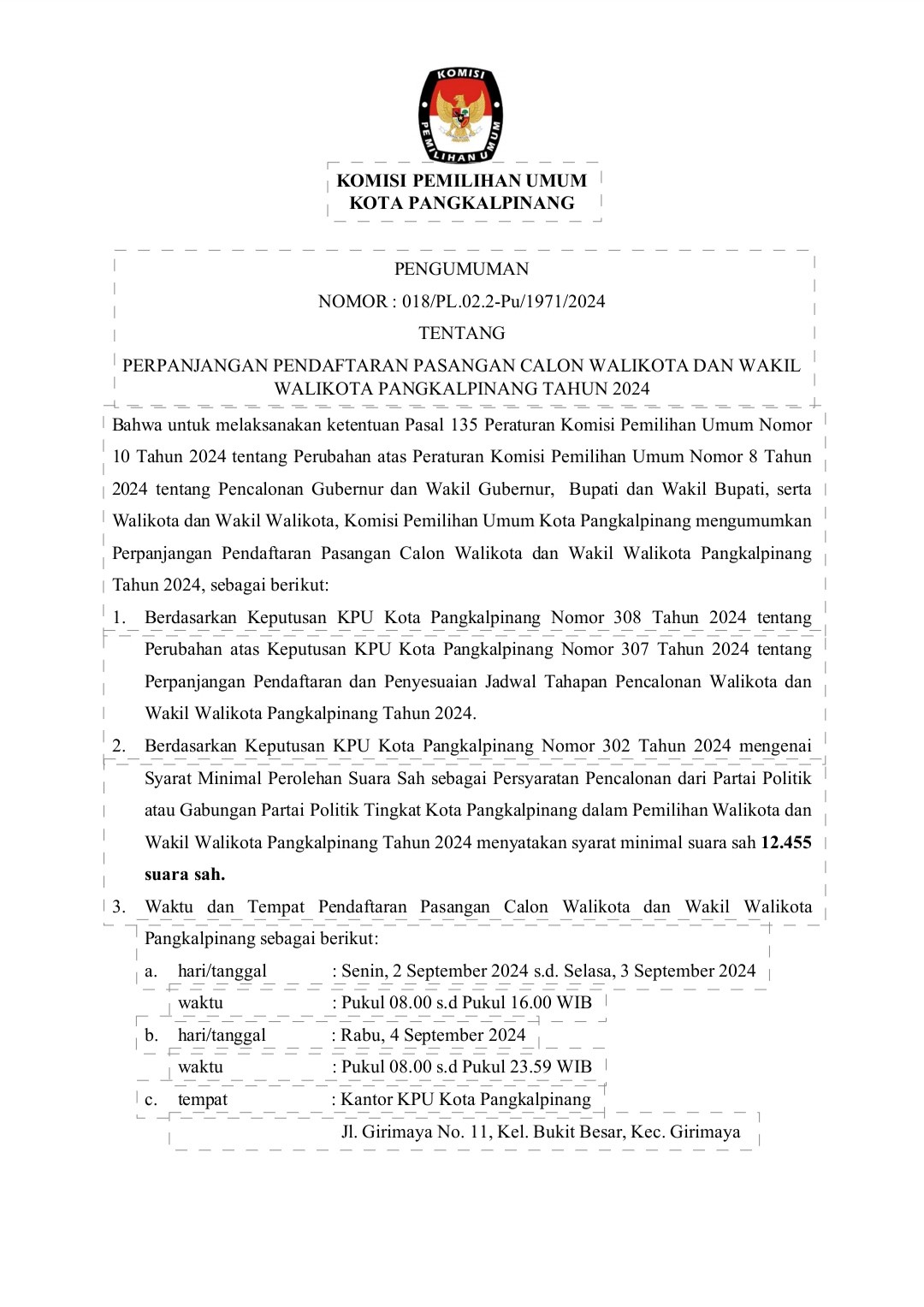 NOMOR : 018/PL.02.2-Pu/1971/2024 TENTANG PERPANJANGAN PENDAFTARAN PASANGAN CALON WALIKOTA DAN WAKIL WALIKOTA PANGKALPINANG TAHUN 2024
