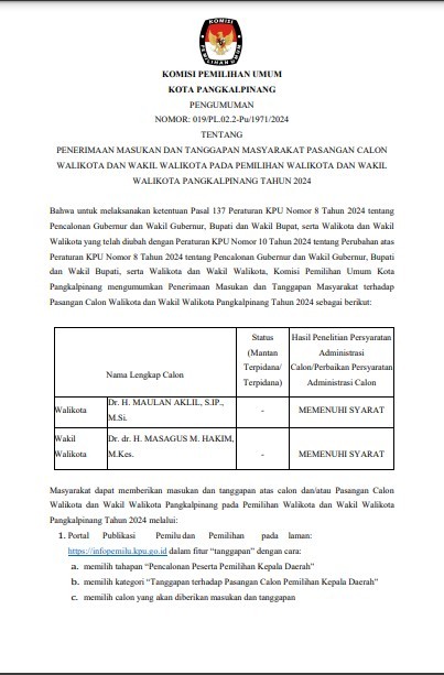 TENTANG PENERIMAAN MASUKAN DAN TANGGAPAN MASYARAKAT PASANGAN CALON WALIKOTA DAN WAKIL WALIKOTA PADA PEMILIHAN WALIKOTA DAN WAKIL WALIKOTA PANGKALPINANG TAHUN 2024
