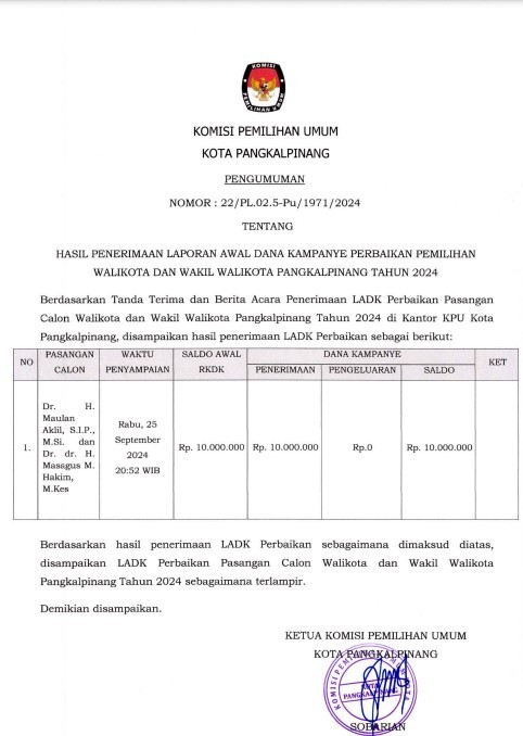 HASIL PENERIMAAN LAPORAN AWAL DANA KAMPANYE PERBAIKAN PEMILIHAN WALIKOTA DAN WAKIL WALIKOTA PANGKALPINANG TAHUN 2024