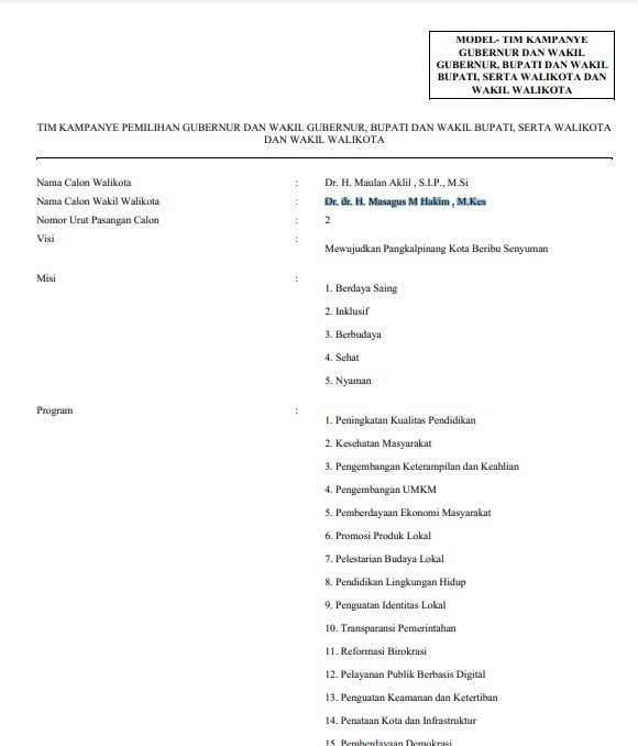 visi misi bakal calon Walikota dan Wakil Walikota Pangklapinang