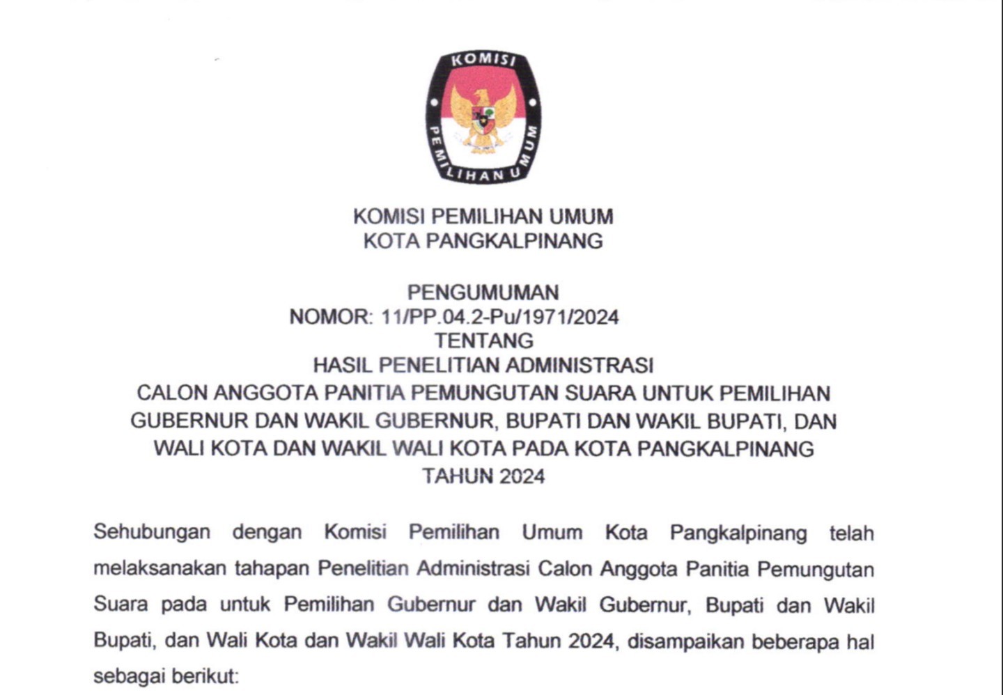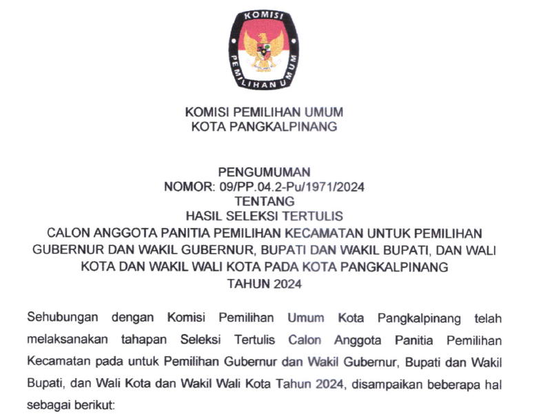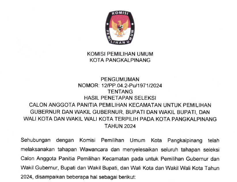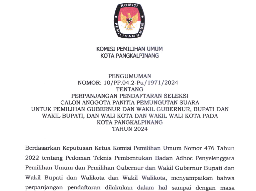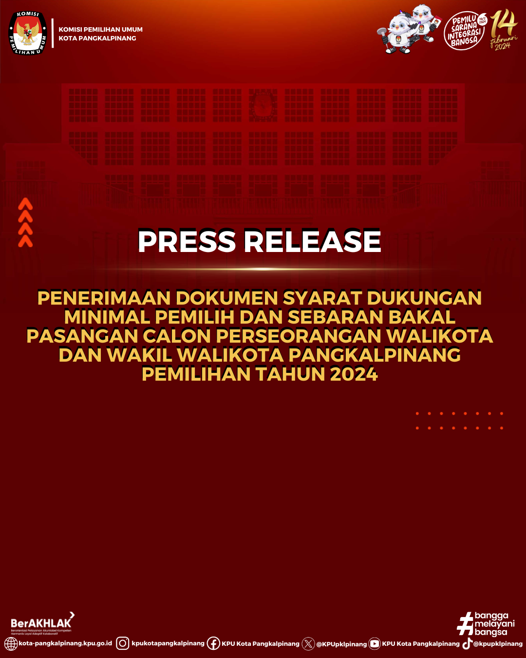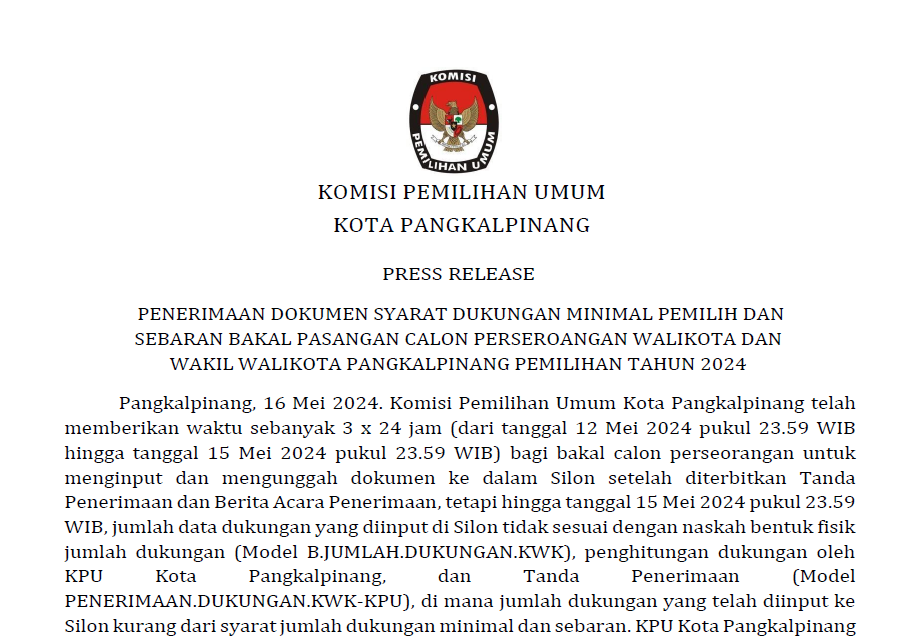 Press Release Penerimaan Dokumen Syarat Dukungan Minimal Pemilih dan Sebaran Bakal Pasangan Calon Perseorangan Walikota dan Wakil Walikota Pangkalpinang Pemilihan Tahun 2024